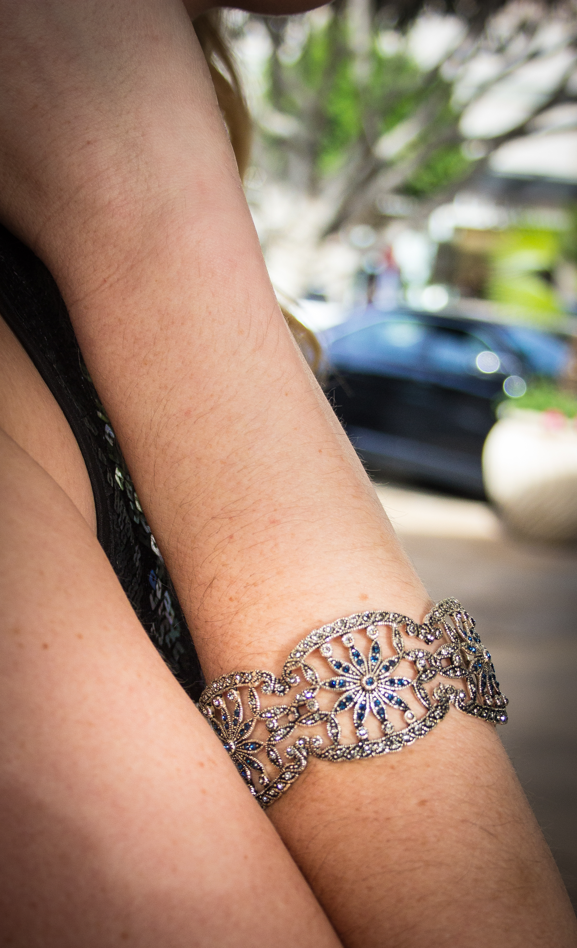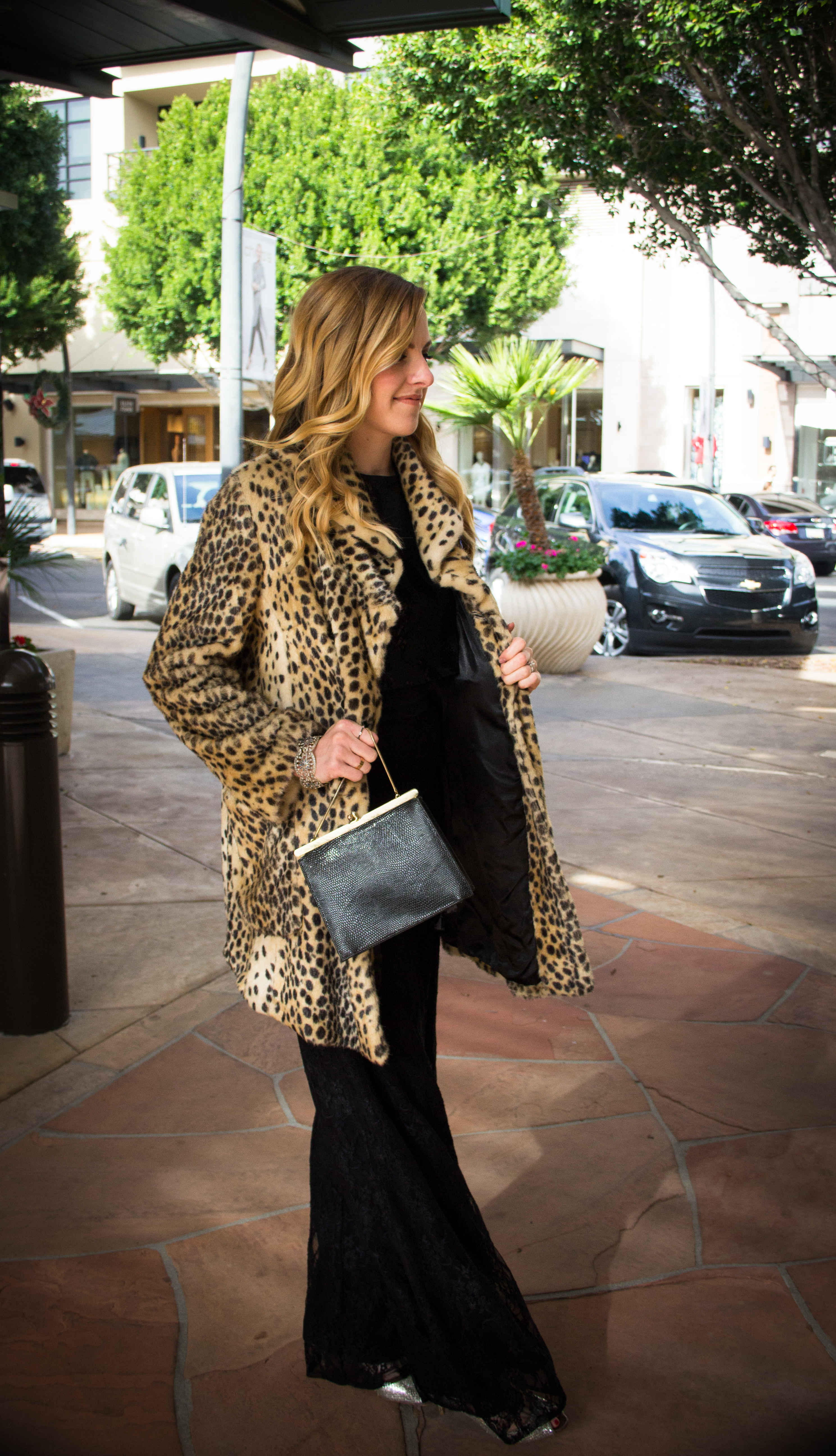 Complimenting the Corey pant is a sequined black crop top that I got on clearance from Urban Outfitters ($10) made by Pins and Needles. I decided to pair the Corey pant with my Jimmy Choo silver peep toe weddings shoes in style Isabel. These shoes were found at Last Chance in near mint condition for a sixth of the retail cost! I love the sparkle of the champagne glitter fabric underneath the lace fabric. It adds just enough shine to compliment my jewels. The jewelry that I chose are J Crew crystal earrings that were purchased for my Breakfast at Tiffany’s themed bridal shower last year and a flower designed Swarovski crystal bangle by Azaara Vintage Designs. I actually purchased the bracelet for my wedding day, but ended up choosing a more delicate bracelet for the big day. The earrings and bangle now work perfectly for holiday parties and weddings! (Click here for the bracelet’s purchase information) The last two items shown are a faux fur cheetah jacket from Forever 21 purchased a couple winters ago and a vintage purse purchased from a designer market in SoHo, NYC. I don’t wear my cheetah jacket too often, but when I do I love bringing it out for special occasions like a holiday party. Its fun, edgy and keeps you warm!