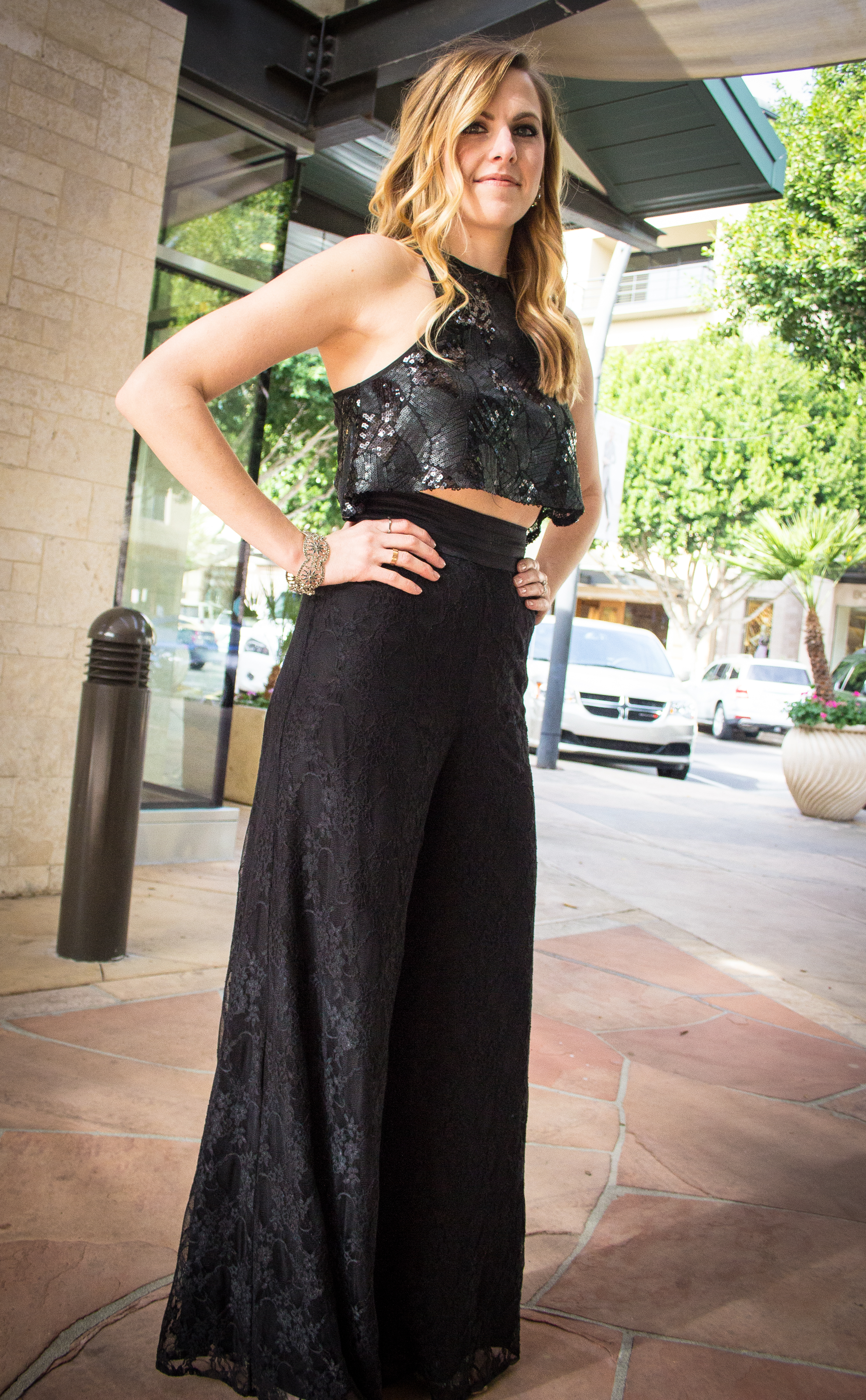 This first look is the Corey pant. It’s a gorgeous high waisted palazzo pant with a sexy full lace leg. My favorite detail is the structured cummerbund element on the waistband that gives a men’s wear feel against the flirty lace pant. The lined fabric is so soft and the side seam zipper allows them to fit like a glove. The best part is the comfort of the Corey pant. I could dance in these all night, but I wouldn’t have to sacrifice feeling glamorous or getting dressed up for the party! I love how effortless and versatile the pant is. After the holiday party I can continue to dress it up with jewels and sequined tops for a night out or a rehearsal dinner. Another option would be to dress them for work with a blazer or a button down. My favorite looks would be to add a sweater for a contrasting texture or tie up a denim shirt and add some sandals for a summery boho chic feel. (Click here for purchasing information)